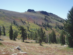 After shady forest sections, open granite slabs, and some short brushy sections, the trail gains the crest at a signed trail junction, having climbed from 6260 to 8160 feet (1900 feet). Since it is nearly entirely on a south facing slopes, I’m glad I went up in the early morning of a hot day.