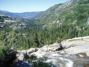 After camping the night at an amazing geological feature, a radially shaped fan of columns from cooling in a dike (no, I can’t explain it, but I have started to ask geologists if they can explain), I climbed up out of the canyon to the north and dropped into Barker Creek. Barker Creek has an incredible variety. Some parts are like the Rubicon River canyon on a smaller scale, wide with floodplain, some parts have cascades over reddish metamorphic rock, some parts higher up are chocked full of granite boulders. In the upper section (of the canyon – I’m not talking about the upper part in the volcanics, which is again completely different), there is one fall of 30 feet, and at the head, a cascade goes down over the granite at a spectacular view of the entire canyon. There is no trail in the canyon, but obviously some other people have ventured here. From the head of the canyon, it is a short walk over the granite benches and past ponds to the sadly abused ORV network around the Rubicon Jeep Trail.