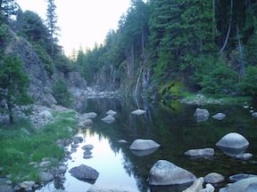 I then followed some routes (there are many, all poorly marked) over to the Rubicon River and headed up the river. Once past the bedrock area where the McKinstry Trail heads south out of the canyon, the river bottom becomes quite wide again, with many active and abandoned river channels. Sometimes the intervening area is forest, sometimes floodplains of boulders. It is all hard to navigate, but beautiful. Just before where Barker Creek comes down from the north, the canyon narrows again, with bouldery stretches and some pools that go from wall to wall. It is necessary to either get wet or climb way up and down again on deer trails. I did some of both, but having a backpack makes me reluctant to tackle the deeper parts. I had thought that I might be able to go all the way up the canyon bottom to the Rubicon Jeep Trail crossing, but the canyon becomes much more rugged where it has a sharp S-curve to the south, and I gave up. I think that the only way the canyon can be negotiated is down-canyon, by swimming many parts, and by climbing around the several major waterfalls that are found higher up in the canyon. You can see two of these large waterfalls in the S-curve, looking down from the canyon walls to the north.