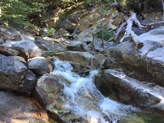 While doing trail work, I camped on the granite ridge which overlooks the Rubicon canyon, just south of Steamboat Creek. It is a great place to watch sunrises and sunsets, and the stars through the night. As I’ve stated elsewhere, Steamboat Creek is seasonal at the trail crossing, but it was still flowing for this trip. If it is dry at the crossing, either explore up or down the creek to find water, or just pick up water at Buckeye Creek on your way there. If you are coming up from the bottom, carry enough water to make Buckeye Creek in case Steamboat is dry. There are some small seeps in the gully, but I think they are seasonal as well.