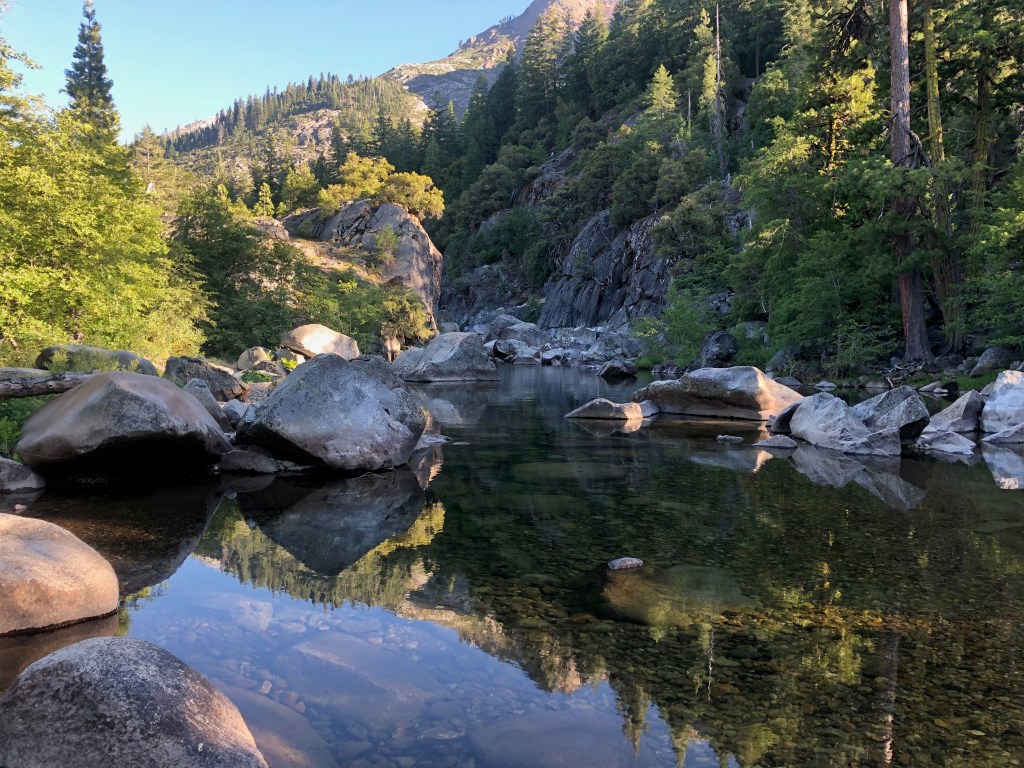 After crossing lower Five Lakes Creek, the route again is lost in the forested flats. It shows up again where it climbs up on the ridge separating Five Lakes Creek drainage from the Rubicon River, and is marked with rock ducks to where it comes back down to the river. I have not been past the crossing of the Rubicon in years, so the condition of the rest of the McKinstry Trail is unknown to me. There are also use trails that follow the ridge between the two drainages down towards the reservoir, but I haven’t been on those in years either.