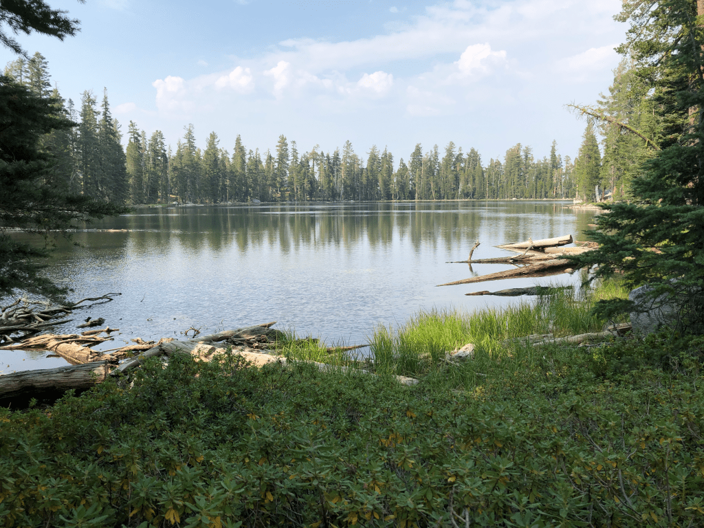 Next day I headed south along the PCT. The smoke is thick now, and I’m hiking with my KN-95 mask, and walking more slowly than usual. The smoke seems to be regional now, not just plumes from the fires. Water at the springs, and more water at the creek south of Barker Pass which is flowing cold and well, though everything else including Miller Creek is dry now. I continued on to Richardson Lake, where I camped along with eight other backpackers. I’ve noticed that all along the PCT there are more campsites, and the campsites are bigger, the result of the huge increase in the number of PCT thru hikers. I see about 40 thru hikers a day now, whereas in the pre-Wild (the book and movie) days, it was about 5. I took an afternoon walk to General Creek, tip-toeing carefully through abundant tiny frogs. Tree frogs, I think.