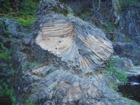 The most amazing geological feature I’ve found is in the Rubicon River Canyon, a radially shaped fan of columns from cooling in a dike. Though the columnar flows are common in the wilderness, with the rim of Powderhorn being the best example, this is an intrusive feature, found in an area of metamorphic rock. Similar structures are not uncommon in pillow lavas, which are formed in water, but they are pretty unusual as an intrusion.
