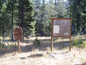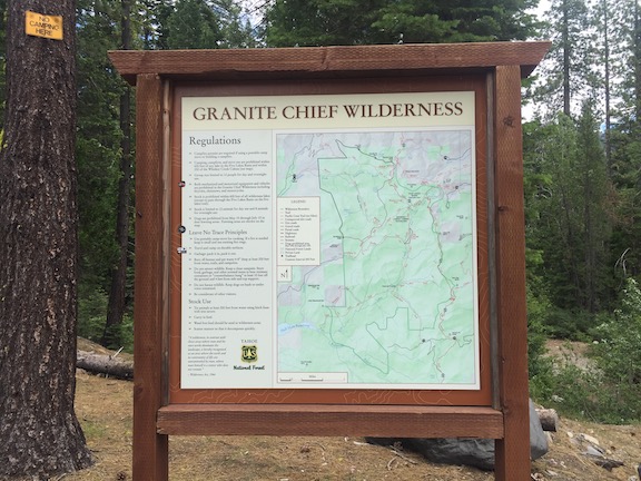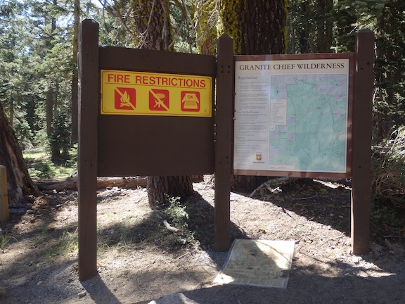 This trailhead is marked by a large number of signs. Coming in on the gravel road, there is first an equestrian trailhead on the left, with one hitching rail and a standard trailhead information sign. Just past this is the main trailhead, which is at the entrance to Talbot Campground. The standard trailhead information sign is in better shape than any I’ve seen for the wilderness. The trail goes past the green gate, immediately crosses Talbot Creek, and is followed by a Granite Chief Wilderness sign at the boundary.