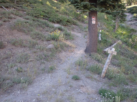 The Alpine Meadows Trailhead has a standard GCW trailhead information sign, and a Five Lakes Trail sign. Note: New trail sign as of 2014.